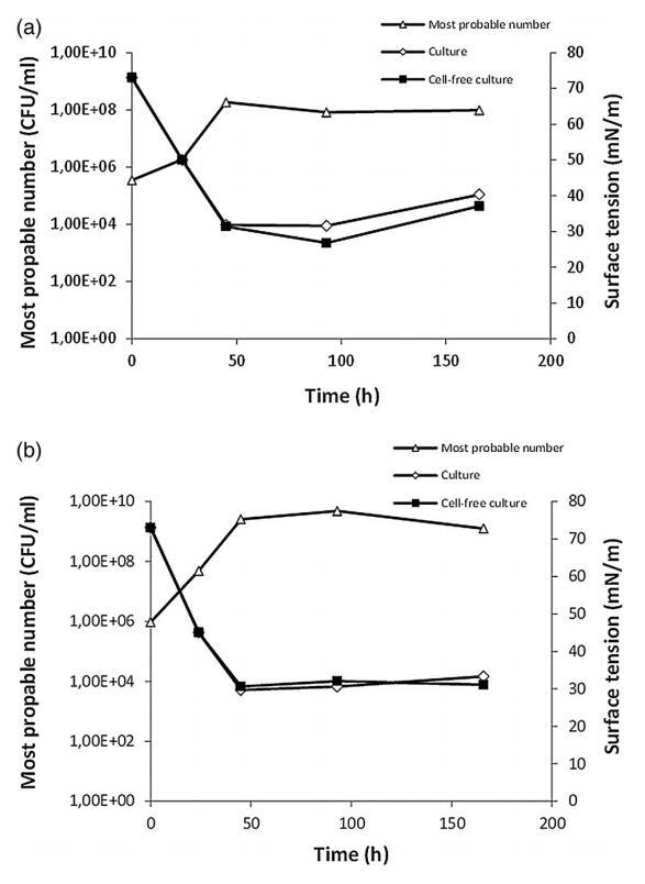 菌株紅球菌屬。 菌株 LF-13 和紅球菌屬。 大約 2 天后,菌株 LF-22 達(dá)到穩(wěn)定期(圖 1)。 LF-13 和 LF-22 的培養(yǎng)物表面張力的最低值分別為 31.8 和 29.3 mN m-1,當(dāng)培養(yǎng)物達(dá)到穩(wěn)定期時(shí)(圖 1)。 無細(xì)胞制劑的值顯示出與培養(yǎng)物類似的降低,表明生物表面活性劑被釋放到培養(yǎng)基中。 從工業(yè)角度來看,將生物表面活性劑分泌到培養(yǎng)基中的分離物很有趣,因?yàn)檫@使得生物表面活性劑的純化過程更簡(jiǎn)單。 [16,44,45]