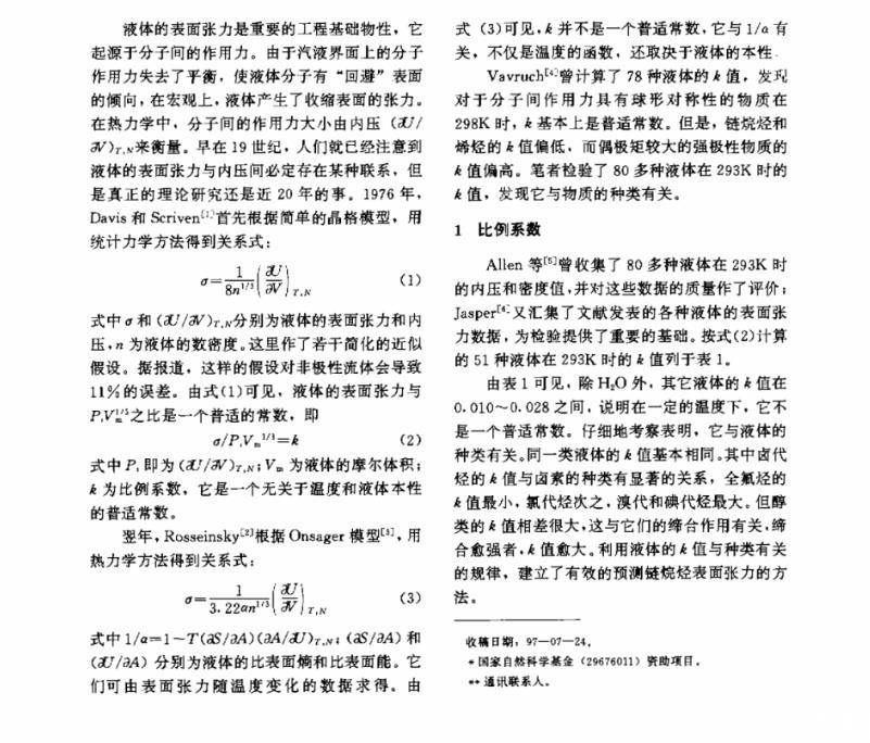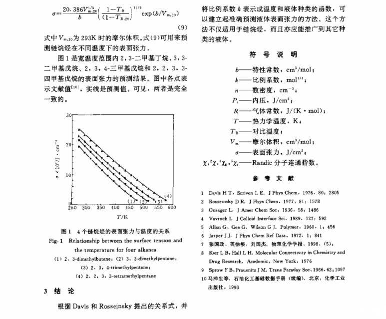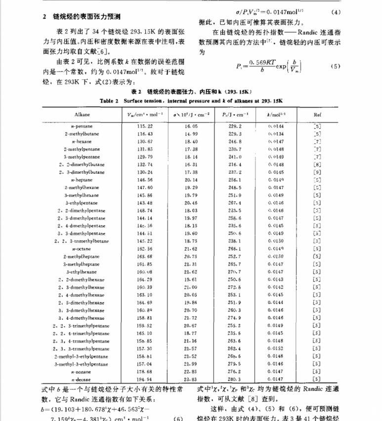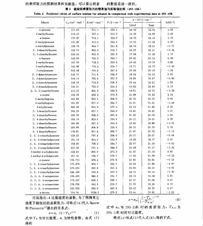 對Davis和Rosseinsky提出的關(guān)系檢驗(yàn)表明,液體的表面張力σ與P1Vm1/3之比不僅取決于溫度,還與液體的種類有關(guān),據(jù)此,建立了一個能由鏈烷烴的分子結(jié)構(gòu)準(zhǔn)確預(yù)測其表面張力的方法。