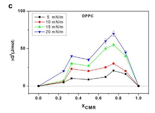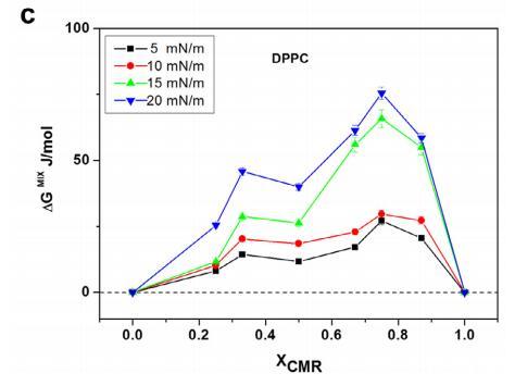 CMR/DPPG 混合膜的 ?Ge 和 ?Gmix 表示負(fù) 從 XCMR ≥ 0.25 到 XCMR = 1.0 的偏差(圖 7a 和 8a)。 ?Ge 和 ?Gmix 負(fù)值表明 CMR/DPPE 單層是 熱力學(xué)穩(wěn)定(圖 7b)。 ?Ge 和 ?Gmix 值為 DPPC 混合單層陽(yáng)性,表明不混溶 (圖 7c 和 8c)。 分子之間的距離取決于 在導(dǎo)致排斥的磷脂頭部基團(tuán)上 互動(dòng)(邁爾斯,1999 年;博格斯,1987 年)。