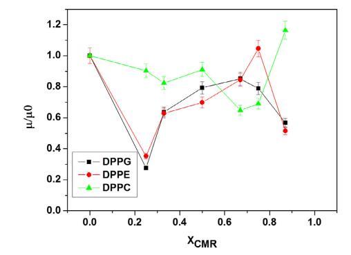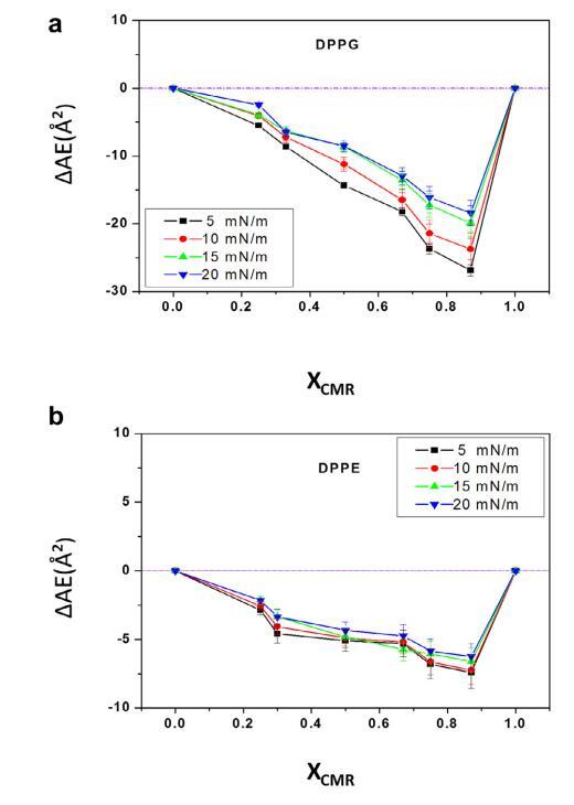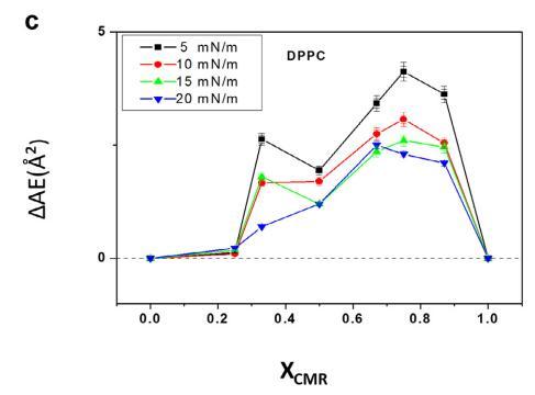 純和混合單層的 pA 等溫線與分子面積的關(guān)系如圖 1 所示。CMR/DPPG 等溫線顯示出與純 DPPG 脂質(zhì)相似的趨勢(shì)(圖 1a)。 相似相 對(duì)所有 CMR/DPPG 混合物都觀察到了轉(zhuǎn)變。 DPPG 和 DPPC 顯示崩潰壓力 (DPcoll) 為 52 mN.m-1 次方和 60 mN.m-1次方 , 分別。 一個(gè)過(guò)渡 (p ffi 3 mN.m-1次方 ) 從液體 發(fā)現(xiàn)純 DPPE 單層膨脹為凝聚相 與 D. coll 在 ffi55 mN.m-1次方 . 為 D. coll 獲得的值 純脂質(zhì)與文獻(xiàn)一致(Vollhardt 等人, 2000; 諾沃塔斯卡等人,2014 年)。