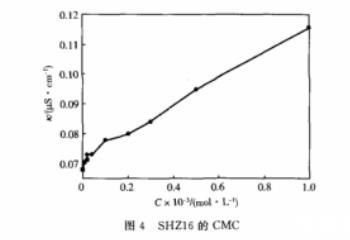 b.SHZ16的臨界膠束濃度為比SHZ14要低,這是由于SHZ16的碳氫鏈比SHZ14稍長,導致疏水基之間的相互干擾減少,造成在表面的自組織能力增強,表面吸附能力有所升高,從而使臨界膠束濃度降低。