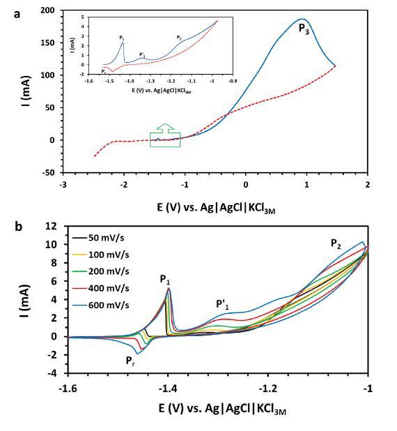 圖2(a)在300 mV/s掃描速率下,鎵銦合金液滴在1 M NaOH中的循環伏安圖。(b)不同掃描速率(50至600 mV/s)下的鎵銦合金液滴循環伏安圖。