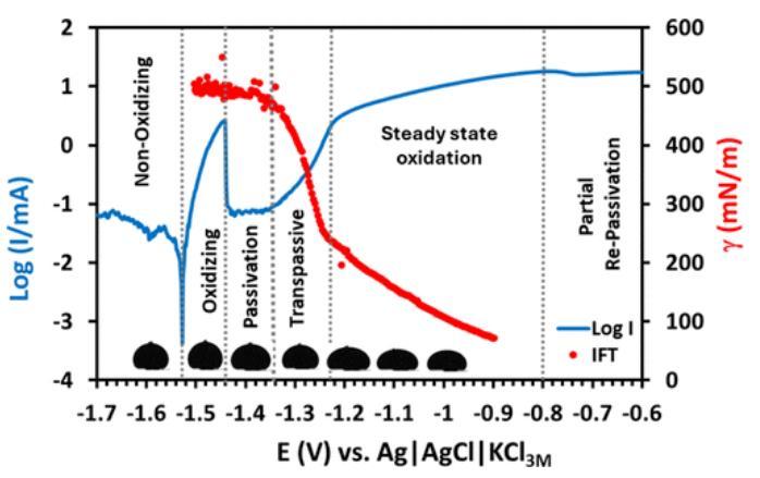 再鈍化階段:在更高電位下,表面部分重新鈍化,表面張力略有回升,液滴變形的趨勢得到一定抑制,推測是表面形成了新的氧化層薄膜。