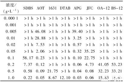 AOT>JFC>SDBS>OA-12>BS-12>1631>CTAB,非離子>陰離子>兩性型>陽離子。非離子表面活性劑APG形成膠束和降低表面張力能力均為最佳,其臨界膠束濃度為0.04 g/L,表面張力為25.61 mN/m。">