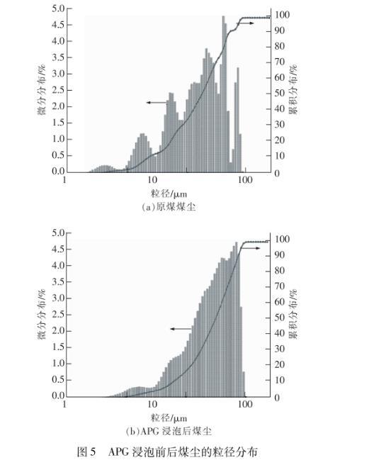 由圖5可見,經APG浸泡后煤塵粒徑增大。原煤煤塵的平均粒徑為22.62μm,經APG浸泡后增大到3518μm。浸泡前煤塵的粒徑分布不均勻,粒徑眾數為48.41μm,浸泡后煤塵粒徑的均一性增強,呈較典型的正態分布,粒徑眾數也增大至76.51μm。這說明煤塵表面親水官能團的增加和分子間締合氫鍵的形成,促使煤塵之間發生了團聚作用,使原本無法發生重力沉降的“小粒徑”煤塵變成了能夠發生重力沉降的“大粒徑”顆粒,加快了沉降速率,縮短了沉降時間,與煤塵沉降實驗結果一致。
