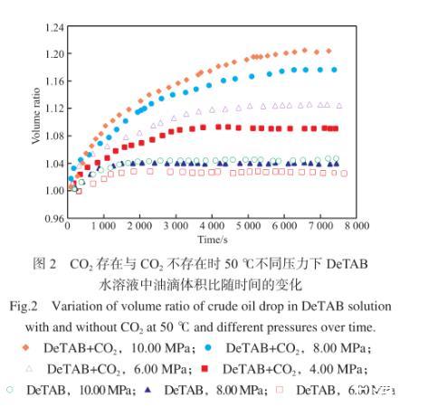 圖2為50℃下,CO2存在與CO2不存在時,DeTAB水溶液/原油體系中,油滴的體積與初始體積比隨時間的變化。由圖2可知,對于原油/CO2/DeTAB水溶液體系,在初始階段,油滴體積增加較快,在油滴體積增加到平衡值附近后,體積增加變緩慢。油滴體積達到穩定所需時間在3 500~6 500 s范圍內。同時,隨著壓力的升高,油滴的平衡體積與初始體積比逐漸增大,這與原油體積膨脹系數隨著CO2壓力增大而增大相吻合。不含CO2的DeTAB水溶液/原油體系中,油滴體積達到平衡值所需時間在1 300 s左右,遠小于CO2存在時達到平衡狀態所需的時間;同時,油滴體積的增加幅度明顯低于CO2存在時的情況。CO2存在時,DeTAB水溶液/原油體系中,油滴體積的明顯增大,說明水中溶解的CO2可以有效地擴散進入油相中,實現其對原油的溶脹效果,這將利于將油藏孔隙中的一部分殘余油排出,從而提高油田采收率。