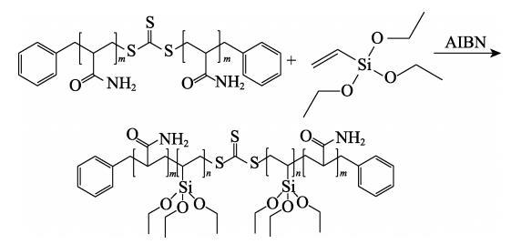 在500 mL四口燒瓶中加入300 g無水乙醇、0.0231 g(0.14 mmol)AIBN和10.0816 g(0.28 mmol)PAM-CTA-4,用超聲波將PAM-CTA-4混合均勻分散,再加入VTES〔其中,n(VTES)∶n(AM)=5∶100、10∶100、15∶100、20∶100〕,在70℃下反應8 h。反應結束后趁熱出料,過濾。在超聲條件下,用正己烷洗滌沉淀,過濾,重復數次,在45℃真空干燥24 h,得到PAM-b-PVTES固體粉末。將上述不同n(VTES)∶n(AM)制得的產物依次命名為PAM-b-PVTES-1、PAM-b-PVTES-2、PAM-b-PVTES-3、PAM-b-PVTES-4。