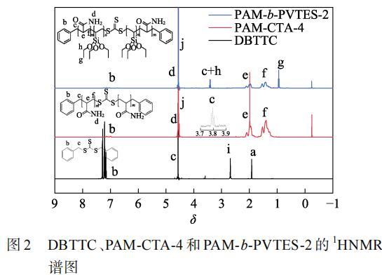 圖2為DBTTC、PAM-CTA-4和PAM-b-PVTES-2的1HNMR譜圖。如圖2所示,DBTTC的1HNMR譜圖曲線中δ=1.92(a)為氘代丙酮的質子峰,δ=7.13~7.31(b)是苯環上的質子峰;δ=4.56(c)的峰為亞甲基(—CH2—)的質子峰;δ=2.62(i)為DBTTC樣品中含有的極少量H2O的質子峰,可以確定成功合成了RAFT試劑DBTTC。PAM-CTA-4和PAM-b-PVTES-2的1HNMR譜圖曲線中,δ=4.80(j)為重水(D2O)的質子峰;δ=7.27~7.48(b)是苯環上的質子峰;δ=4.82(d)為酰胺基(—NH2)的質子峰;δ=1.95~2.24(e)是主鏈上的次甲基(—CH—)的質子峰;δ=1.31~1.66(f)是主鏈上的亞甲基(—CH2—)的質子峰。在PAM-CTA-4曲線中,δ=3.78~3.82(c)為與苯環相連亞甲基的質子峰。PAM-b-PVTES-2曲線中δ=3.39~3.43(c+h)為與苯環相連和乙烯基中的亞甲基(—CH2—)質子峰;δ=0.93~0.95(g)為有機硅中甲基(—CH3)的質子峰。通過FTIR譜圖和1HNMR譜圖可以確定合成了PAM-CTA-4和PAM-b-PVTES-2。