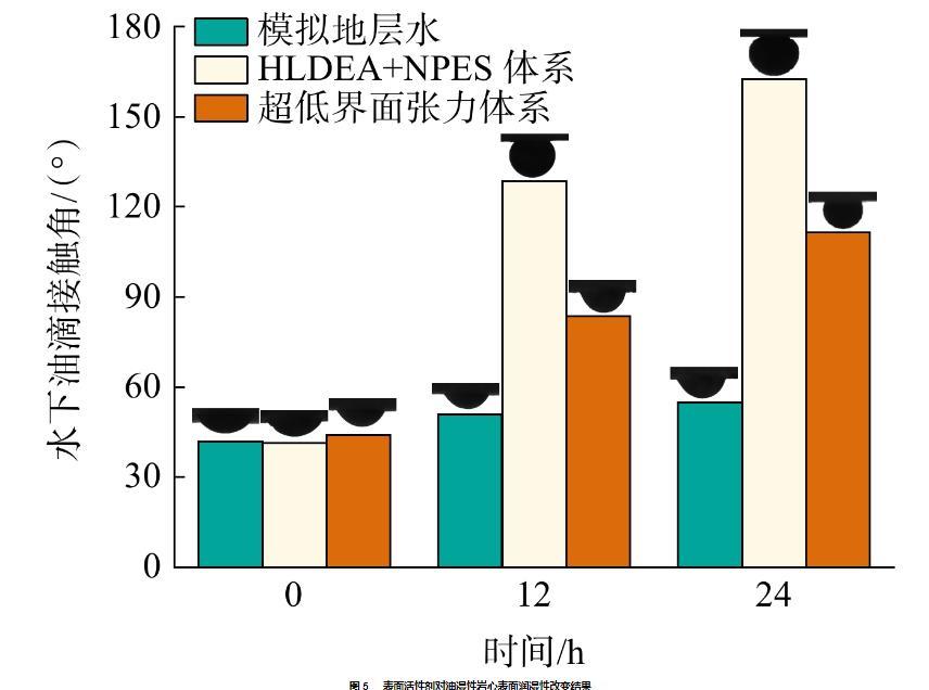 通過評價表面活性劑體系在親油巖心表面的潤濕性來考查體系潤濕調(diào)控能力,實驗結(jié)果如圖5所示。從圖5可知,地層水可較微弱地改變親油巖心表面潤濕性,但表面仍為親油表面。超低界面張力體系作用下,可在24 h內(nèi)將表面水下油滴接觸角由43.98°改性到111.35°。調(diào)控界面潤濕性效果最為顯著的是HLDEA+NPES體系,24 h內(nèi)水下油滴接觸角由41.34°增至162.53°,實現(xiàn)強親水改性。