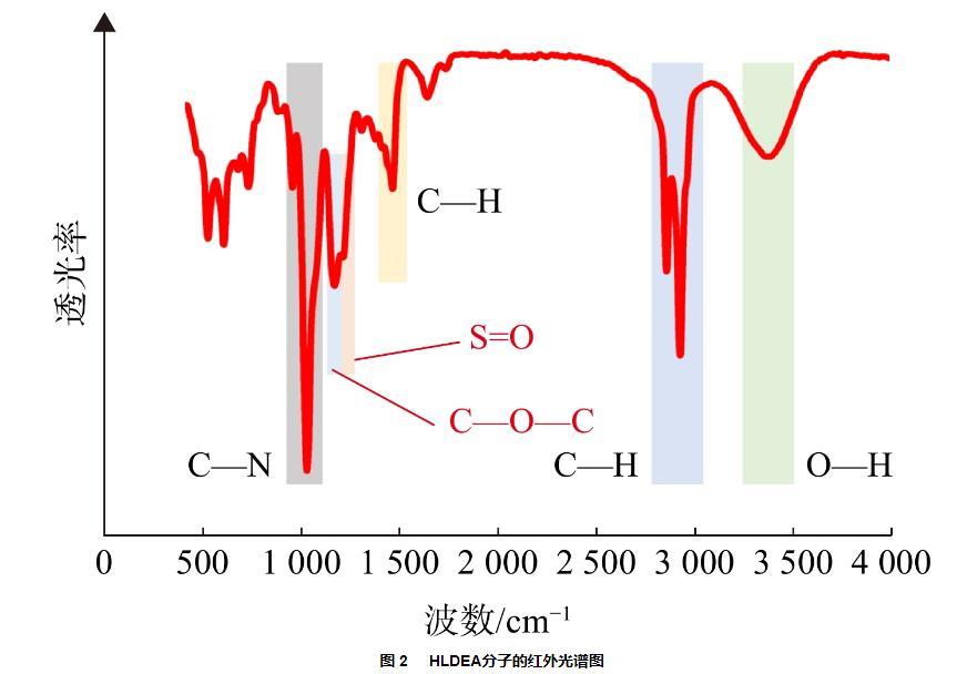 紅外光譜中峰的位置及形狀與分子中鍵的種類和環(huán)境具有對應關(guān)系,通過分析所得譜圖可得到物質(zhì)的化學和結(jié)構(gòu)組成的相關(guān)信息。圖2所示為HLDEA分子的紅外光譜圖。由圖2可知,合成后的HLDEA在3354.44 cm?1處出現(xiàn)O—H鍵的伸縮振動峰,2921.96 cm?1和2852.77 cm?1處的雙峰代表C—H鍵的伸縮振動峰,1463.05 cm?1處出現(xiàn)C—H鍵的彎曲振動峰,1028.50 cm?1處出現(xiàn)C—N鍵的伸縮振動峰,1215.97 cm?1處出現(xiàn)了S=O鍵的伸縮振動峰及1168.25 cm?1處C—O—C鍵的伸縮振動峰。C—O—C鍵和S=O鍵對應的振動峰來自生成的醚鍵和引入的磺酸根,這兩處峰的存在證明了反應成功發(fā)生,磺酸基團被接到LDEA分子上。