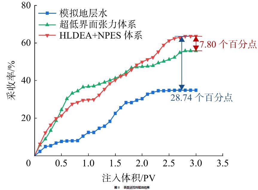 3)HLDEA+NPES體系可將原油采收率提高至63.60%,在水驅(qū)基礎上提高了28.74個百分點,在超低界面張力體系驅(qū)基礎上提高了7.80個百分點。