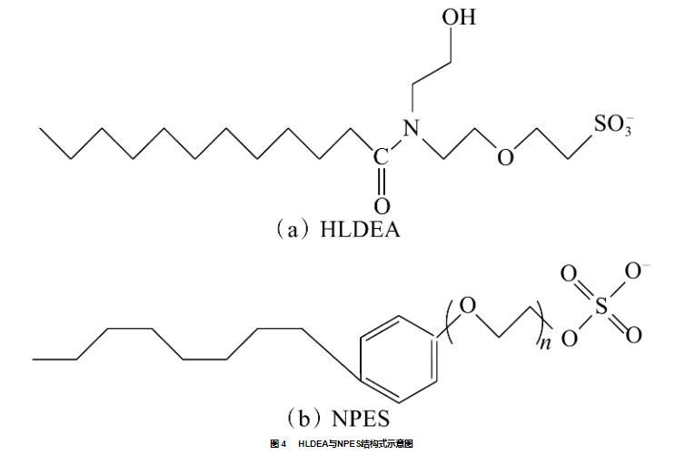 將配制好的穩(wěn)定性優(yōu)異的復配體系[0.15%(w)HLDEA+0.15%(w)助表面活性劑]置于75℃條件下,測定復配體系的油水界面張力,結(jié)果見圖3。由圖3可得,復配后體系油水界面張力隨時間均出現(xiàn)先下降后基本保持平衡的趨勢。HLDEA與兩種陰非離子型表面活性劑APEC-4Na和NPES復配后體系的油水界面張力降低至接近超低界面張力水平(10?3 mN·m?1)。這是因為HLDEA分子小、親油性高,其擴散速度快且傾向于進入油滴內(nèi)部,同時,溶液中的NPES分子隨時間推移逐步被吸引于油水界面,尾鏈與HLDEA分子相互糾纏形成緊密結(jié)構(gòu),提高了油水界面吸附膜的致密程度,從而使界面張力大幅降低。最終優(yōu)選出的助表面活性劑為NPES,在與HLDEA復配后體系界面張力值為3.8×10?3 mN/m。HLDEA與NPES結(jié)構(gòu)式見圖4。作為對比的超低界面張力體系油水界面張力值為2.9×10?4 mN/m,較HLDEA+NPES體系界面張力低了一個數(shù)量級。
