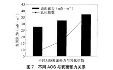通過數據統計看出,AOS表面張力與乳化指數的關系則如圖7所示。