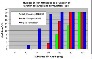 原始配方中超過一半以上的液滴在20°的傾斜角滾落,40°時(shí),全部液滴滾落。Agrosurf NEC38比Agrosurf SSP更有效,可防止所有液滴在30°時(shí)滾落,避免60%的液滴在40°滾落。客戶可根據(jù)這種方法,尋找更加優(yōu)異的表面活性劑。