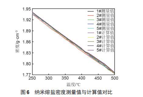 根據(jù)混合物密度計(jì)算公式對(duì)納米熔鹽的密度進(jìn)行計(jì)算后,與實(shí)驗(yàn)測(cè)量得到的密度進(jìn)行對(duì)比。