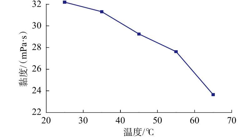 圖9質量分數為2.7%的ACS-2高黏表面活性劑體系溶液黏度隨溫度的變化
