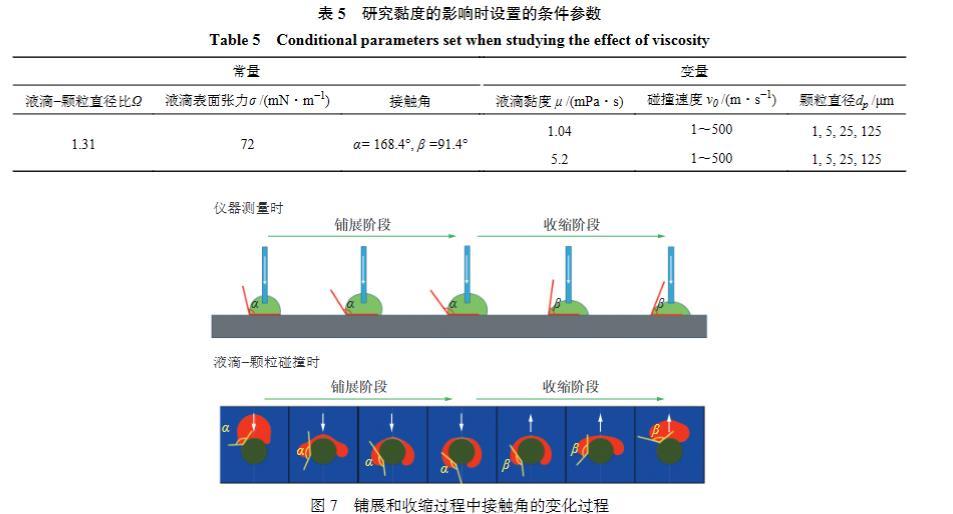 由于碰撞速度、粒徑和液滴黏度均會對液滴與顆粒的碰撞行為產生明顯影響,筆者針對這幾個因素設置了不同的數值模擬工況。具體工況參數見表5所示,其中液滴鋪展過程中的前進接觸角為α;液滴收縮過程中的后退接觸角為β。利用數值模擬軟件的自動保存功能,對碰撞行為發(fā)展過程中不同時刻的模擬數據進行了保存。如圖7所示,當液滴在顆粒表面鋪展時,在迭代過程中將接觸角值設置為α。在液滴在顆粒表面的鋪展過程轉變?yōu)槭湛s過程的時刻,將接觸角數值由α改為β,再進行后續(xù)的迭代計算。