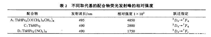 表2列出了配合物A、C、D在氯仿溶液中,指定熒光激發(375nm)和熒光發射峰波長、相對強度及躍遷指定。配合物A、C、D是由不同取代基構成的雙酞酞菁鋱(III)配合物,當取代基為給電子的壬氧基時(A),可使基態與最低激發態之間的躍遷幾率增大,有較強的熒光行為,使熒光強度增加;而取代基為吸電子的硝基時(D),它使熒光強度下降,故有較弱的熒光行為;而酞酞菁是環上無取代基的絡合物C,故它的熒光強度居中。