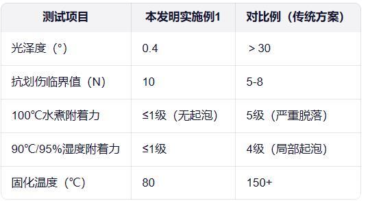 失效分析:對比例2(高羥樹脂<5份)因交聯(lián)密度不足,抗劃傷性能僅5N;對比例5(純高羥樹脂)因未反應(yīng)羥基殘留,水煮后附著力驟降。本發(fā)明通過樹脂配比精準(zhǔn)控制,兼顧啞光需求與力學(xué)性能。