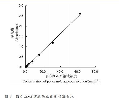 圖3是以麗春紅-G溶液的質量濃度為橫坐標,以不同濃度麗春紅-G溶液在510nm處吸光度為縱坐標的標準曲線,其方程為y=0.0413x-0.0142(R2=0.9980)。