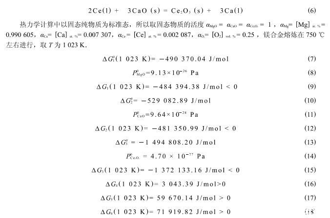 但由于Ce元素在合金熔體中是分布不均勻的,如圖6所示的點(diǎn)能譜分析可以看出,Ca和Ce在此處的相對原子分?jǐn)?shù)分別達(dá)到了2.50%和3.34%.按照此處的原子活度計(jì)算得到:Delta G_4(1023~K)=-12885.19~kJ/mol<0,Delta G_5(1023~K)=17418.58~kJ/mol>0,Delta G_6(1023~K)=56138.14~kJ/mol>0,在此處式(4)中的反應(yīng)可以自發(fā)地進(jìn)行.由此可知,式(4)、(5)、(6)的反應(yīng)在局部元素分布不均勻的區(qū)域有可能發(fā)生置換反應(yīng).
