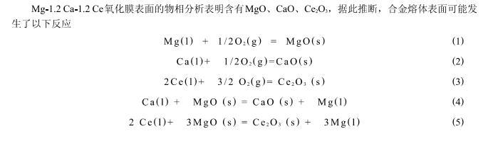 4)通過氧化膜的截面檢測和熱力學(xué)計(jì)算分析得出Mg-1.2Ca-1.2Ce的形成的氧化膜大致分為3層:外層是MgO,中間層是CaO,內(nèi)層是Ce2O3。