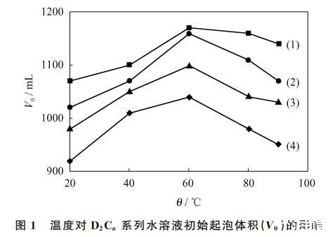 圖1 溫度對 D2Cn 系列水溶液初始起泡體積(V0)的影響