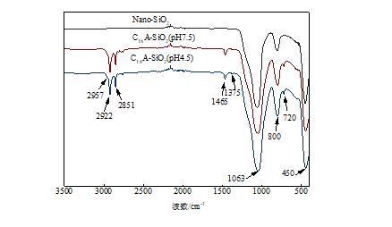 圖1為 Nano-SiO2、 C16A-SiO2(pH4.5)、C16A-SiO2(pH7.5)的 FTIR譜圖。