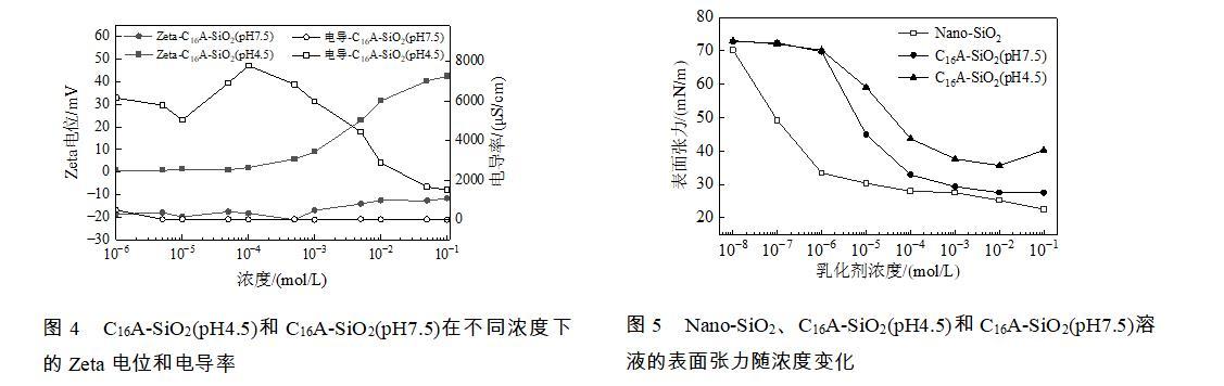 圖4 C16A-SiO2(pH4.5)和C16A-SiO2(pH7.5)在不同濃度下的Zeta電位和電導率
