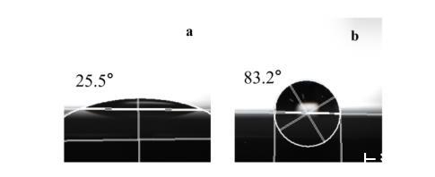 圖3 Nano-SiO2(a)和C16A-SiO2(pH4.5)(b)的接觸角表征