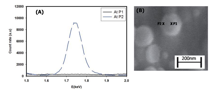 圖1顯示了核殼顆粒組裝的SEM圖像。這清楚地顯示了直徑為158±5 nm的球形顆粒(粒徑的高斯分布在插圖A中給出),具有暗芯和淺電暈(插圖B)。典型的磁芯直徑約為100 nm,電暈寬度約為40 nm。通過光散射實(shí)驗(yàn)確定了組件的直徑。光散射數(shù)據(jù)分析得出的直徑為100–200 nm,最大顆粒數(shù)的直徑為161±10 nm,這與從SEM數(shù)據(jù)獲得的尺寸一致(從DLS獲得的顆粒尺寸的高斯分布在ESI?圖S2中給出)。EDAX結(jié)果證實(shí)了粘土片在組件中的位置。圖2(A)和(B)顯示了給定結(jié)構(gòu)在兩個(gè)不同位置(xP1和xP2)的能量色散分布。它們清楚地顯示了核心(xP1)內(nèi)不存在硅(粘土結(jié)構(gòu)中的主要元素之一),以及日冕(xP2)中硅的豐度。33,34這證實(shí)了粘土片被排除在這些結(jié)構(gòu)的核心之外。因此,可以得出結(jié)論,核心是疏水的,主要含有姜黃素納米顆粒(姜黃素不溶于水),而外殼(電暈)具有自組裝血小板的傾向(LAPONITE®不溶于乙醇)。因此,我們有一個(gè)結(jié)構(gòu),其中的核心是一個(gè)有機(jī)相(乙醇)周圍的水暈。由于其溶解性偏好,姜黃素納米顆粒和LAPONITE®血小板分別優(yōu)先位于有機(jī)相和水相。