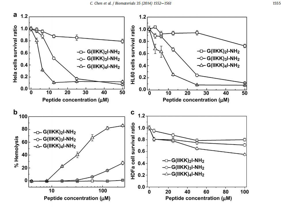 按照濃度依賴性模式,重復次數(shù)較多或長度較長的肽在殺死癌細胞(HeLa和HL60細胞)方面更有效,但對正常細胞(紅細胞和HDFa細胞)的體外毒性也開始增加,如圖1aec所示。總的來說,就體外抗癌活性和細胞選擇性而言,G(IIKK)3I-NH2是最佳序列,其對HeLa和HL60細胞的IC50值為15和25 mM,EC50遠大于250 mM(IC50:濃度導致50%的癌細胞生長抑制;EC50:濃度誘導50%的紅細胞溶解)。重要的是,HDFa細胞對這些肽有良好的耐受性,例如,在濃度低于50 mM時,G(IIKK)3I-NH2對HDFa細胞的影響微不足道(圖1c)。我們合理設計的短肽的這種性能明顯優(yōu)于天然AMP,如馬蓋寧和蜂毒素,并且在有效性、選擇性甚至耐藥性方面也優(yōu)于抗癌藥物順鉑[12e15]。例如,在類似的實驗條件下,magainin-2對HeLa細胞的IC50低于60 mM,而蜂毒肽在5 mM下的EC50則低得多,顯示出對宿主細胞的高毒性[12e14]。