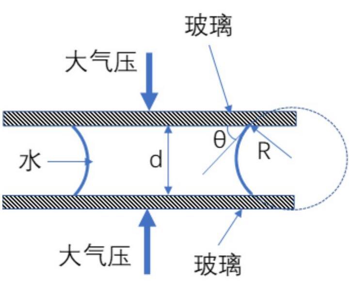 我們可以想象,當兩片玻璃間隙非常小的時候,這個凹液面的曲率就會非常大,在這個時候,液體壓力與大氣壓的差就會很大,因此把玻璃擠壓在一起的力也就很大。我們可以用楊-拉普拉斯公式來估算一下。