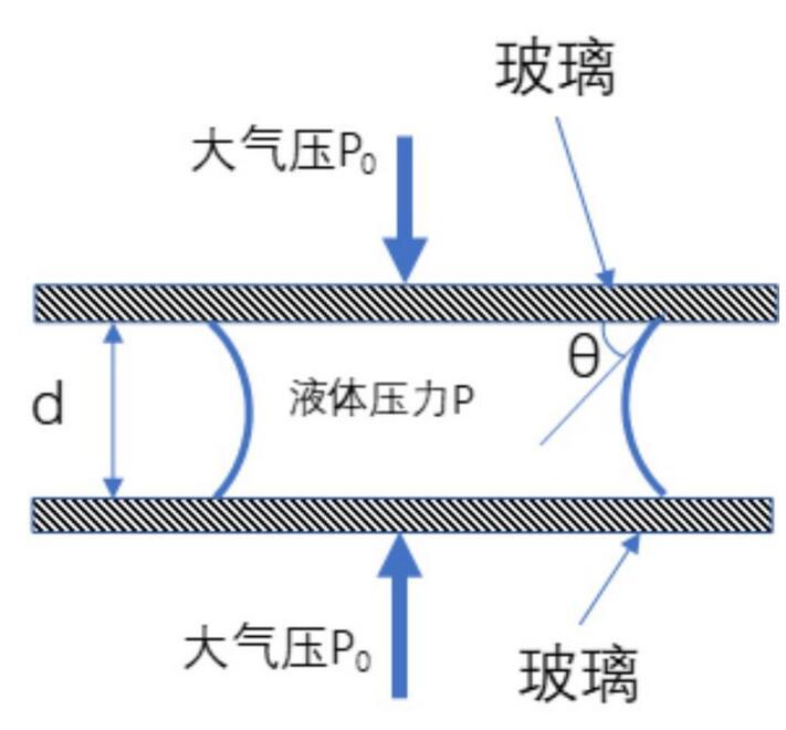 在兩片玻璃之間,形成的凹液面就是因為這個接觸角的原因: