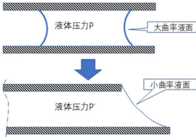 因此,根據楊-拉普拉斯方程(我們假設液膜面積尺度遠大于間隙尺度),這個凹液面所產生的液體內部與大氣之間的壓力差為:
