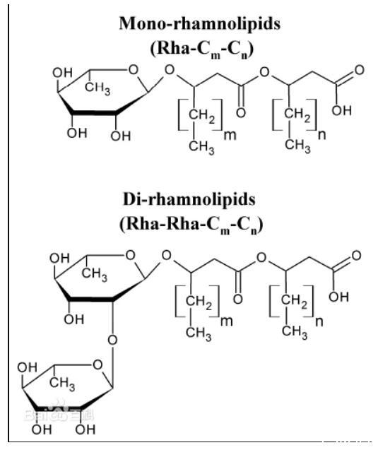 鼠李糖脂的結構多達幾十種,一般在學術界經??吹诫p鼠李糖脂和單鼠李糖脂的表述。