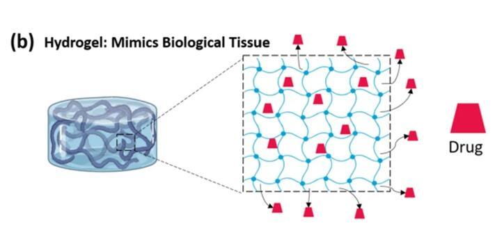 水凝膠是通過物理或化學(xué)交聯(lián)方法形成的三維聚合物網(wǎng)格。網(wǎng)格之間留有一定的空間,由于該網(wǎng)格的存在,水凝膠的結(jié)構(gòu)富含多孔性。聚合物網(wǎng)格可以截留大量的水,并防止其運(yùn)輸?shù)酵獠凯h(huán)境,從而模仿生物組織的物理特性。這種保水能力,使水凝膠能夠提供良好的生物相容性和封裝藥物分子的平臺(tái)。該網(wǎng)格可以限制不同酶的滲透,從而保護(hù)包封的藥物免受各種酶降解。
