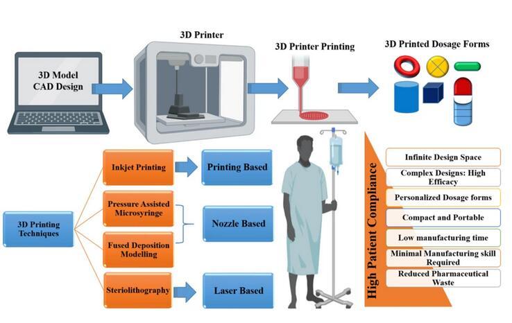 3D打印技術(shù)中不需要造粒、壓片以及包衣等環(huán)節(jié),并且可以靈活控制藥物的劑量以及釋放,所以該技術(shù)逐漸發(fā)展起來。3D打印技術(shù)主要有選擇性激光燒結(jié)(SLS)、光固化成型(SLA)、熔融沉積成型(FDM)、半固體擠出成型(SSE)以及噴墨成型打印(IJP)等方式。3D打印藥物目前的代表藥物,為FDA批準(zhǔn)的Spritam。