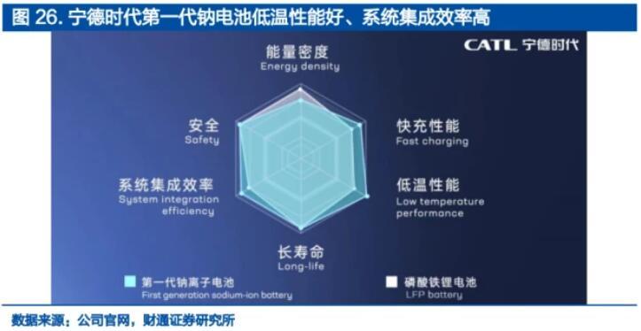 目前星空鈉電和寧德時代都采用了普魯士藍化合物作為正極材料。其中寧德時代于2021年發布的鈉離子電池,電芯單體能量密度達到了160Wh/kg,為目前全球最高水平,具有良好的快充性能,在常溫下充電15分鐘,電量可達80%;也具有良好的低溫穩定性,在零下20°C低溫的環境下,仍然有90%以上的放電保持率。