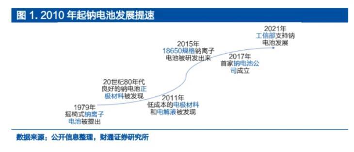鈉電池隨著產業化加速,量產在即。1979年法國的Armand提出了“搖椅式電池”的概念,開始鈉離子電池的研究。隨后Delmas和Goodenough發現了層狀氧化物材料可作為鈉電池正極材料,Stevens和Dahn發現硬碳材料作為負極有良好的鈉離子嵌脫性能。2010年以來,鈉電池的研發進程加速。2011年中科院物理所研究員團隊開始了鈉離子電池核心技術的研發,自此以后開發出低成本的電極材料。2017年國內第一家專注于鈉離子電池研發和生產的公司中科海鈉成立。2021年寧德時代成功舉行了第一代鈉離子電池線上發布會。2022年,中科海納和傳藝科技均預計2023年量產其鈉離子電池。