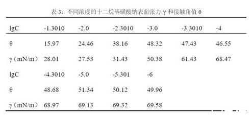 取不同濃度的十二烷基磺酸鈉溶液各25mL,與其濃度相同的枯草菌脂肽鈉溶液25mL混合,使其濃度比約為1。對混合溶液攪拌,靜止30min,用表面張力儀測試其表面張力和接觸角。其原始數據如下表: