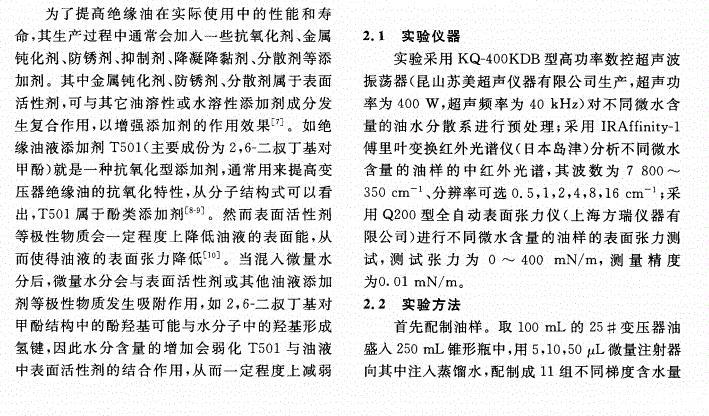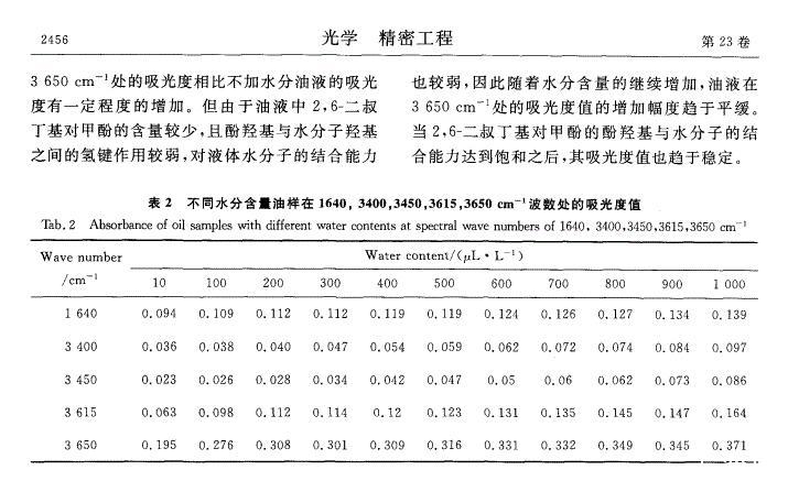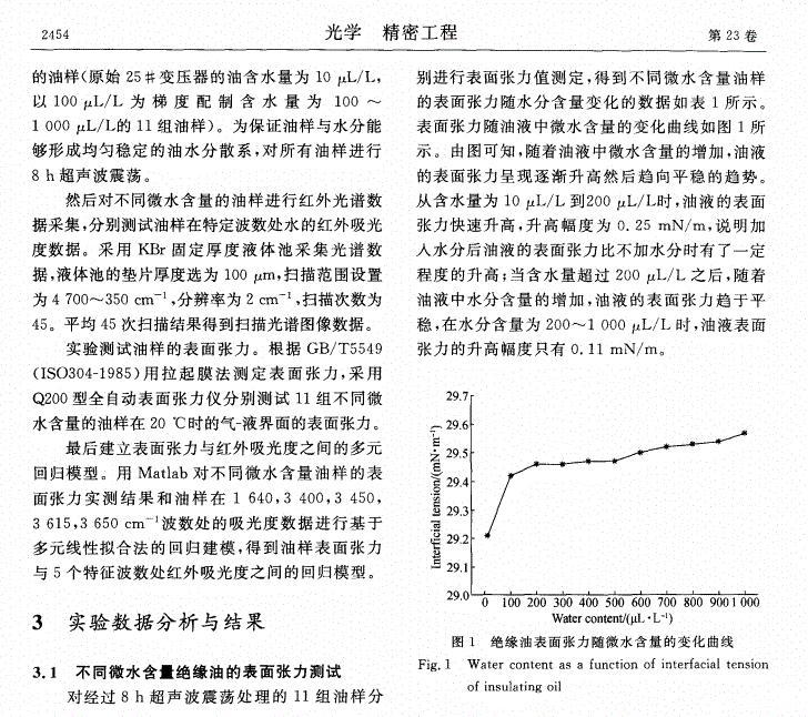 【摘要】:為了有效監(jiān)控絕緣油的運行狀態(tài),采用定量分析方法探討了微量水分對絕緣油表面張力的影響規(guī)律。通過配制不同微水含量的絕緣油樣,對每組油樣進(jìn)行表面張力測試,然后對油樣進(jìn)行紅外光譜掃描,獲取了油樣中水分在特征波數(shù)處(1 640,3 400,3 450,3 615cm-1)的吸光度值。分析了油液中2,6-二叔丁基對甲酚(T501)等添加劑對油樣表面張力變化規(guī)律的影響。結(jié)果表明:油樣中水分含量與水分特征吸光度值之間有較好的相關(guān)性(相關(guān)系數(shù)分別為0.964 1,0.984 8,0.984 5,0.944 0),油樣表面張力和1 640,3 400,3 450,3 615,3 650cm-1波數(shù)處油樣吸光度值的變化亦均呈現(xiàn)良好的正相關(guān)性。建立了油樣表面張力與特征波數(shù)處油樣吸光度值的多元線性回歸模型,擬合精度為0.992 8;根據(jù)模型得到的表面張力計算值與實際測量值誤差為-0.07~0.06%,吻合性較好。文中的實驗可為含微水絕緣油的表面張力檢測提供理論支撐。