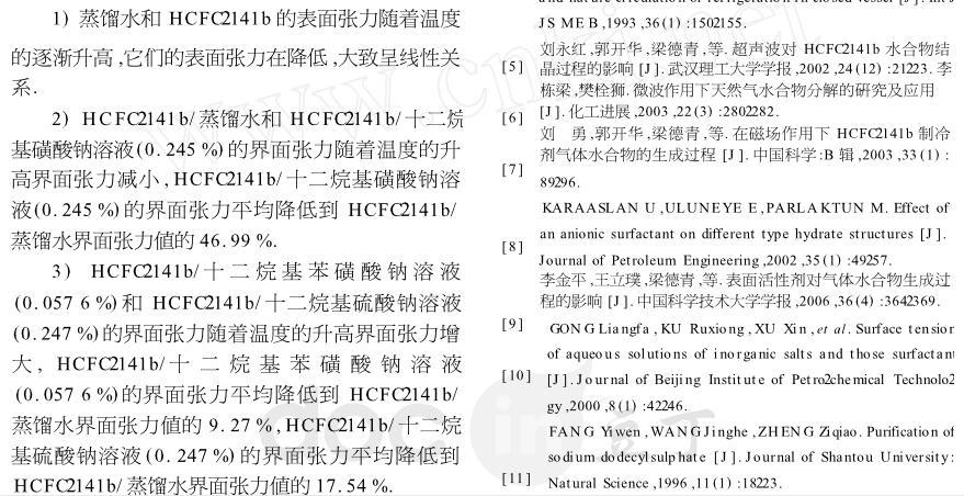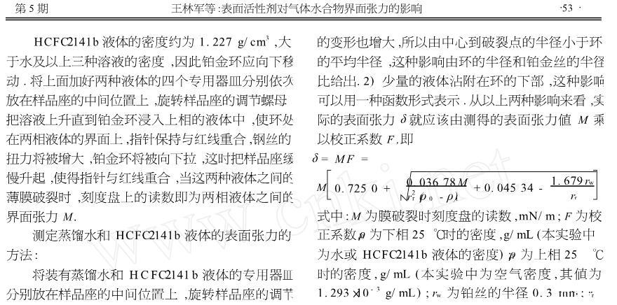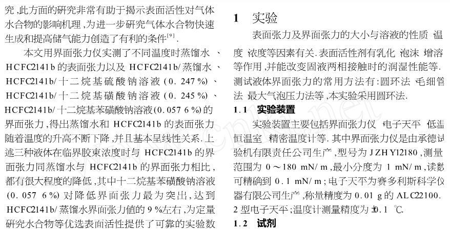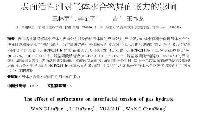 【摘要】:表面活性劑能夠減小液體的表面張力以及兩相液體間的界面張力,界面張力的減小有利于促進氣體水合物快速形成和提高水合物儲氣能力.為定量研究兩相液體間界面張力對氣體水合物形成的影響,用界面張力儀實測不同溫度時蒸餾水、HCFC-141b的表面張力以及HCFC-141b/蒸餾水、HCFC-141b/十二烷基硫酸鈉溶液(0.247%)、HCFC-141b/十二烷基磺酸鈉溶液(0.245%)、HCFC-141b/十二烷基苯磺酸鈉溶液(0.057 6%)的界面張力,測試結果表明,表面活性劑對降低兩相液體間界面張力的作用十分明顯,其中十二烷基苯磺酸鈉溶液對降低界面張力最為突出,降到HCFC-141b/蒸餾水界面張力值的9%左右,為定量研究氣體水合物等優選表面活性劑提供了科學的依據。