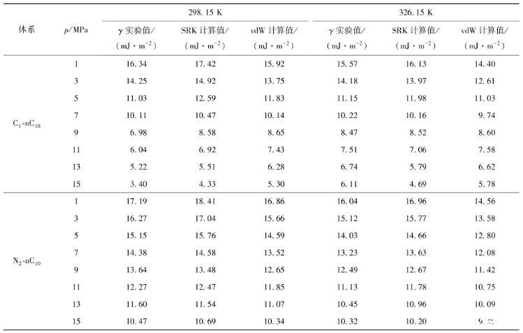 (2)與vdW模型和實驗數據對比表明:在相同的溫度下,隨著壓力的升高,C1-nC10和N2-nC10混合物在納米孔中的界面張力逐漸減小,SRK和vdW模型均能準確地預測界面張力。
